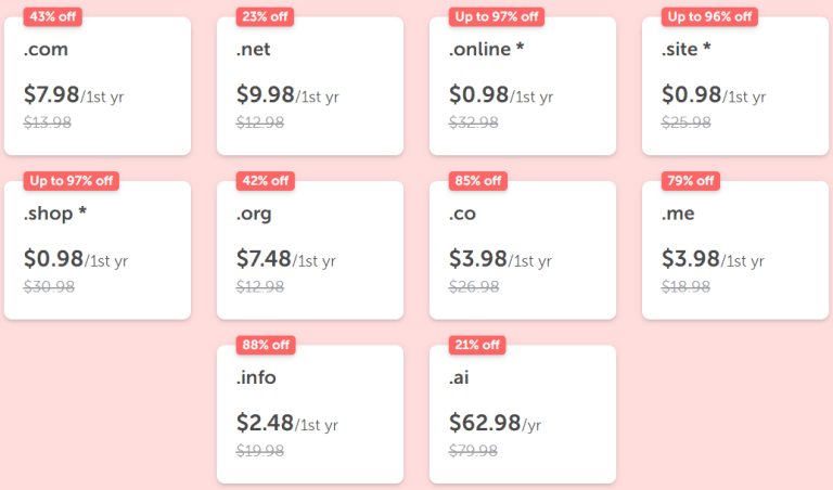 Namecheap是一家知名的域名注册商,它提供有丰富的域名后缀可以选择。在本次促销活动中,顶级域名优惠高达97%,首年注册价格0.98美元起,.com、.net、.online、.site、.shop、.org、.co、.me、.info、.ai域名等均有不错折扣优惠。