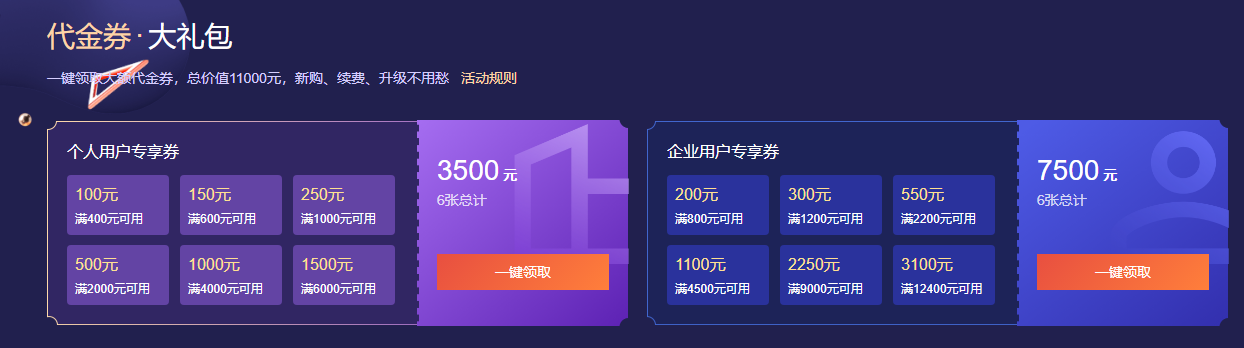 代金券礼包分为个人用户专享券、企业用户专享券,分别共计6张。其中个人用户专享券总计价值3500元,企业用户专享券总计7500元,自领取开始有效期30天,单个账户每类代金券只能领取一次,可用于新购、续费、升级场景,活动产品除外。