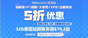 八月盛夏,RAKsmart给大家带来了促销活动,国外站群多IP服务器、独立服务器、大带宽服务器、VPS和云服务器5折钜惠来袭,32G美国站群服务器月付低至$79.5,大带宽服务器仅需$44.5/月。与此同时还有首月6.5折专属折扣,叠加价值$385的超值大礼包。 一、RAKsmart新用户秒杀专区(续费同价) VPS$1.99,云服务器$3.99,享续费同价!限30天内新注册RAKsmart用户购 […]...